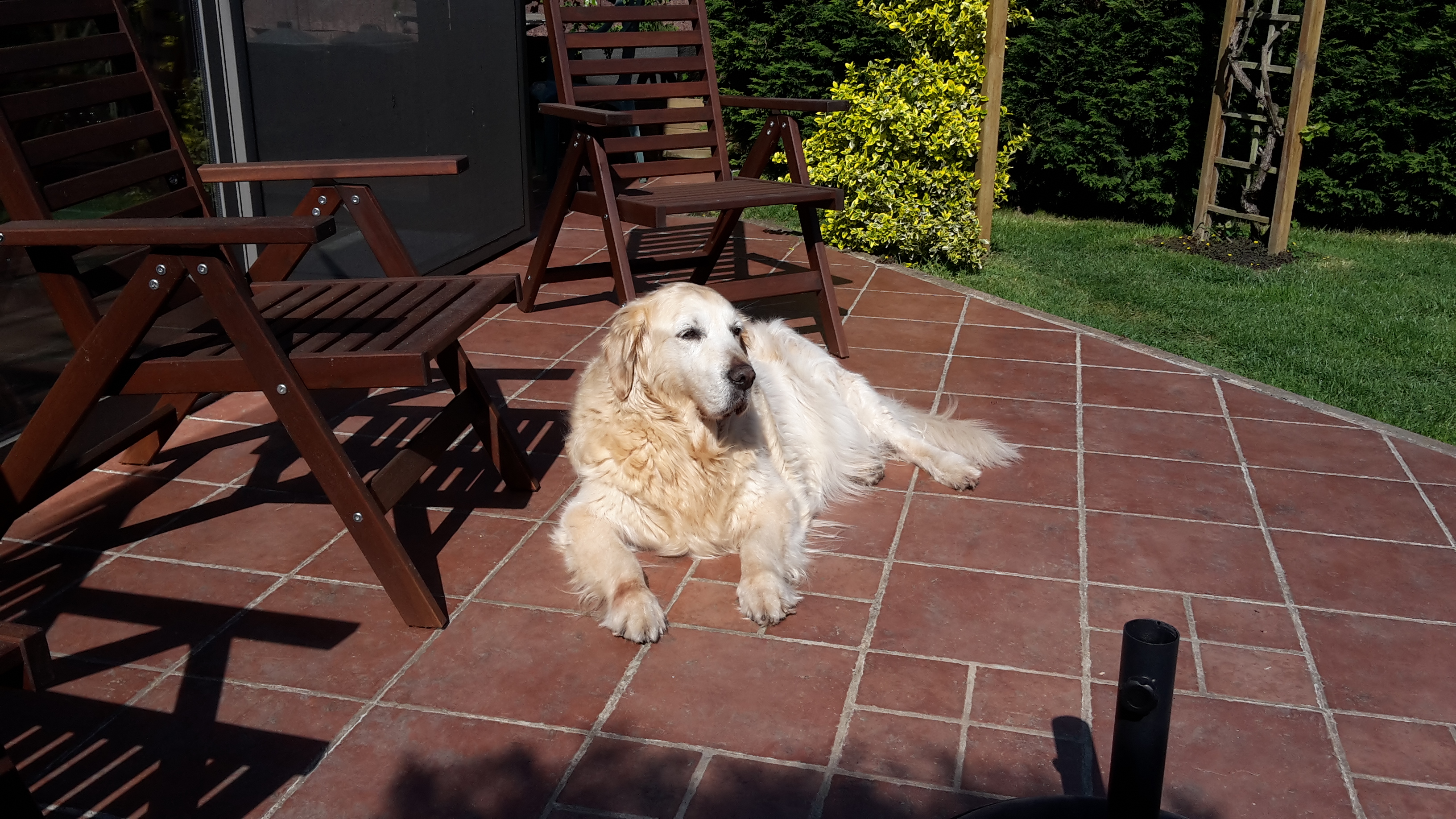 Nous avons adopté notre Golden chez vous en avril 2010, Sammy aura 11 ans le 14 février 2021. Il a toujours eu une très bonne santé mais maintenant petits problèmes articulaires aux pattes arrières. Je le promène encore tous les jours 20 min, il est très gentil avec les enfants et nous l'adorons.